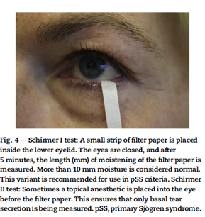 Schirmer test is a standard assessment for measures of aqueous tear production (Fig. 4). Though it can be shortly troublesome for the patient, it is safe, easy to perform, and inexpensive and is demonstrated in the picture below. Although a Schirmer-I test has an approximately 20% false-negative rate, normal tear flow in the face of ocular foreign body sensations suggests an alternative diagnosis such as blepharitis.