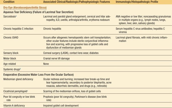 The anatomy of the tear film informs the differential diagnosis of a dry eye. The tear film consists of three major layers: the outer lipid layer, the middle aqueous layer, and the inner mucin layer. The middle aqueous layer is diminished in Sjogren’s syndrome. Conditions associated with infiltration of the lacrimal glands (e.g., sarcoidosis) and diminished tear flow (e.g., medications, ageing, and estrogen deficiency) may also decrease aqueous tear flow.
