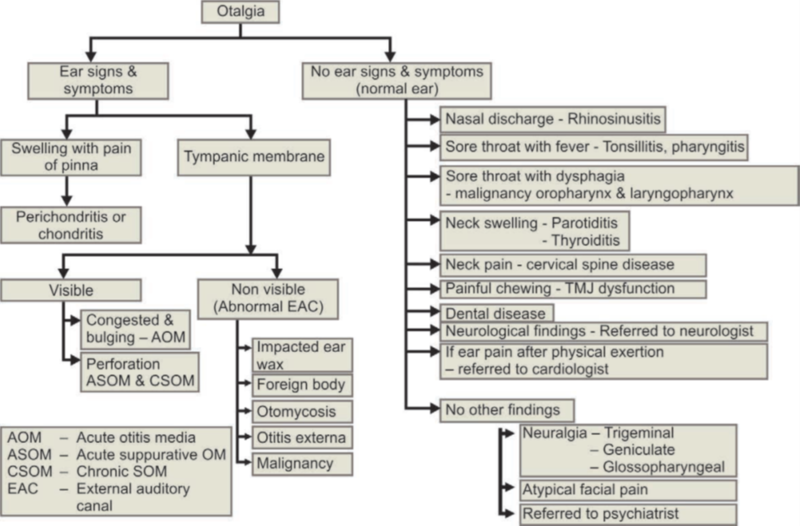 - Presenting complaints: Otalgia and otorrhea. Ear pain may be aggravated with jaw movements. Itching is present in some cases.