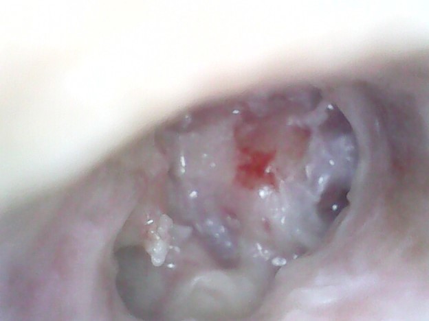 - Later on: Edematous and exquisitely tender canal occluded with purulent squamous debris.