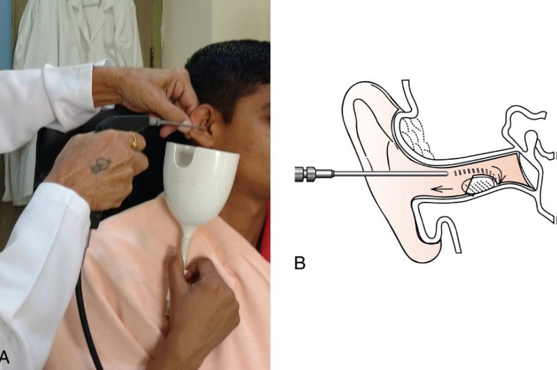 The patient is seated comfortably and the diseased ear faces towards the doctor. A towel is placed on the shoulder. The patient’s head is slightly tilted toward the shoulder. The return fluid is gathered in a kidney tray that is tightly held deep below the ear. It uses boiled tap water that has been cooled to body temperature (or regular saline).
