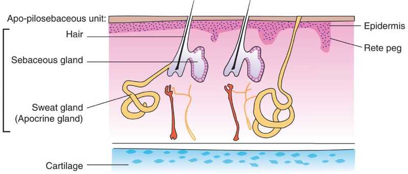 Sebaceous and ceruminous (modified sweat glands) glands open into the space of the hair follicle. Both of these glands' secretions combine with keratin and desquamated epithelial cells to create wax. This lubricates the ear canal and entraps the foreign material that enters the canal.