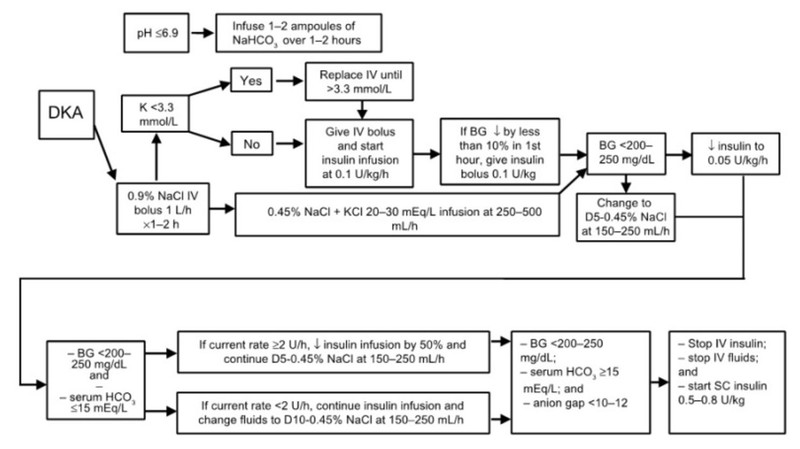 The IV fluid of choice in the management of DKA or HHS is Isotonic saline (0.9% Saline). Saline should be started at a rate of 10-20 ml/kg. At least 1 L of fluid should be administered within the first hour of the presentation. Over the next 8 hours, 0.9% sodium chloride should be given in combination with potassium chloride to correct overall K+ depletion.