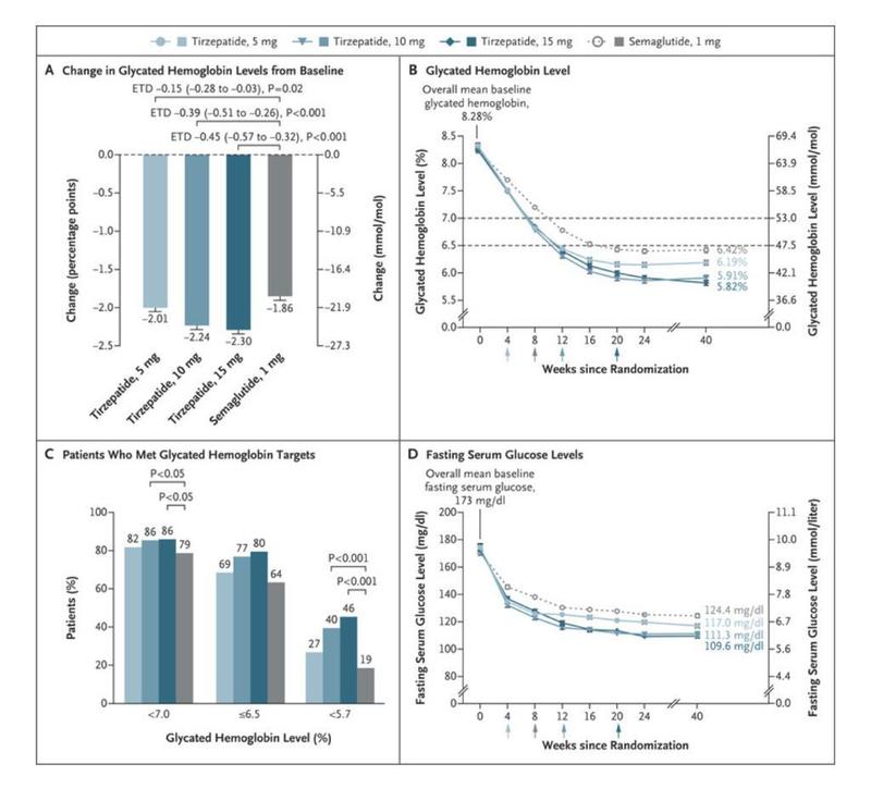 - In the SURPASS-1 to -5 clinical trials, the efficacy of tirzepatide in people with T2D was investigated which showed