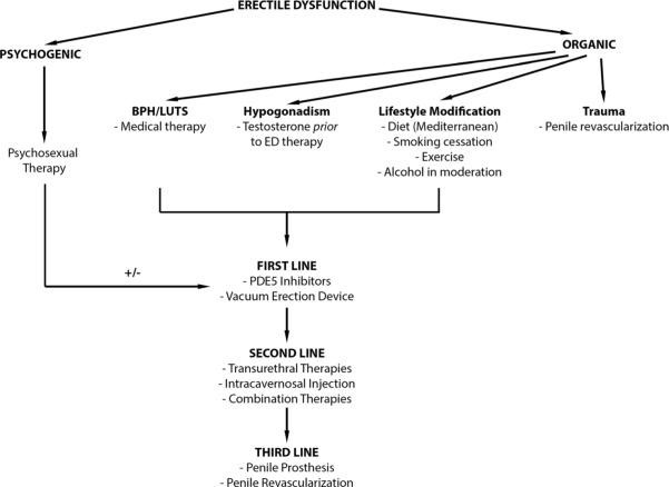 The treatment of ED comprises psychosexual therapy, lifestyle modifications, and medical and surgical interventions. Psychotherapy is considered as a first-line ED therapy, is both noninvasive and effective, and can be combined with other therapies.
