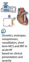 - Treatment of acute HF consists of addressing specific causes (i.e. acute coronary syndrome, hypertension emergency, arrhythmia, mechanical cause, pulmonary embolism, infection, and tamponade) as well as diuretics, vasodilators, inotropes, vasopressors, short-term mechanical support, and renal replacement therapy. The indications and timing of these therapies vary according to the clinical presentation (i.e. acute decompensated heart failure, acute pulmonary oedema, isolated right ventricular failure, and cardiogenic shock) and severity of the condition.
