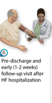 - A pre-discharge visit and an early follow-up visit within 1-2 weeks of release from an HF hospitalisation are advised to evaluate symptoms of congestion, medication tolerance, and to initiate and/or increase the dose of evidence-based therapy.