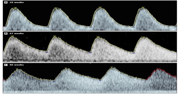 UA Doppler becomes abnormal when embolisation damages 30 per cent of the placental villous vasculature [6]. When 60 to 70 per cent of the placental villous vasculature is obliterated, flow in the UA can become absent or even reversed at the end of the cardiac cycle.