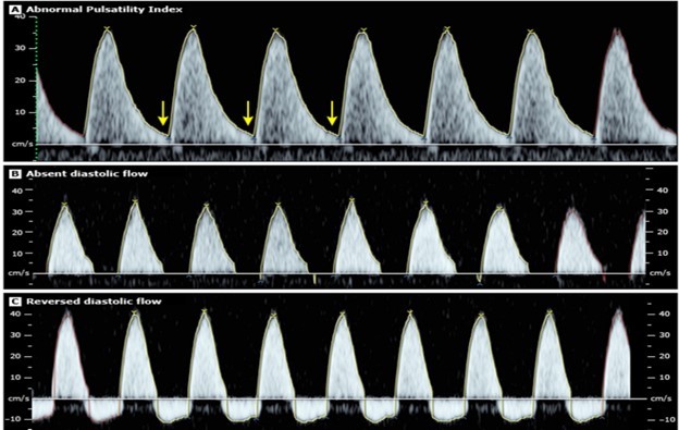 Abnormal Doppler velocimetry of the uterine arteries and foetal vessels (eg, umbilical, middle cerebral, ductus venosus) suggests reduced perfusion of the placental villous vasculature from both the maternal and foetal compartments.