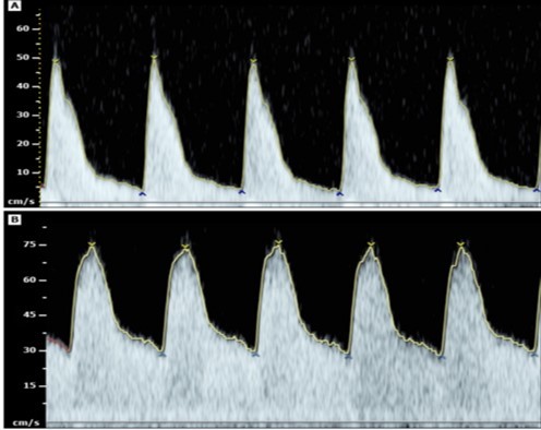 Fig.3: middle cerebral artery Doppler flow velocity waveform in A- normal growing foetus, B- foetal growth restriction. (note the high diastolic flow in B and also high peak systolic velocity)