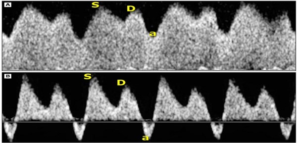 - S/D ratio: Peak systolic velocity/end-diastolic velocity