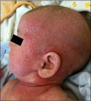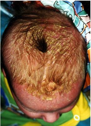 An 8-week old baby presents with raised, scaly, greasy patches on his scalp.