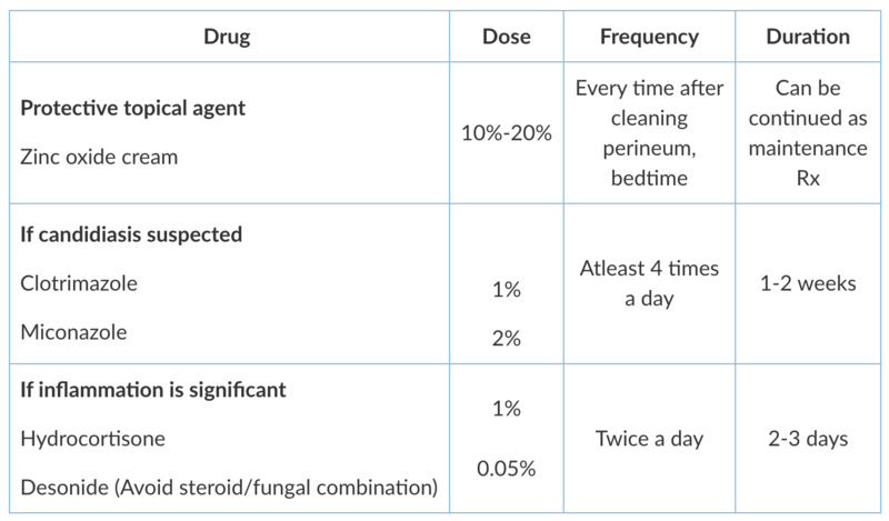 - Initial steps like application of barrier creams like Zinc oxide and keeping the diaper area clean and dry may be enough to heal.