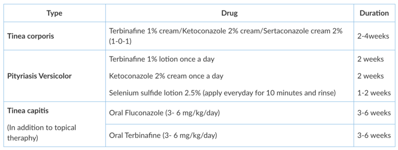Tinea corporis & Pityriasis versicolor- Topical therapy with azoles and allylamines is the first line of treatment.