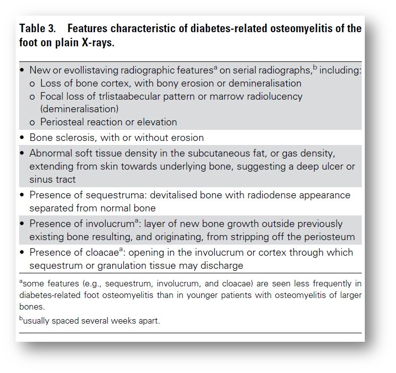 6. Magnetic resonance imaging (MRI) should only be ordered when the diagnosis of diabetes-related osteomyelitis of the foot remains in doubt despite clinical, plain X-rays and laboratory findings. PET, leucocyte scintigraphy or SPECT can be used as an alternative to MRI to diagnose osteomyelitis of the foot.