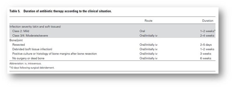 - Systemic antibiotics should be selected as per guidelines, the antibiotics should be administered for 1-2 weeks for skin or soft tissue DFI.