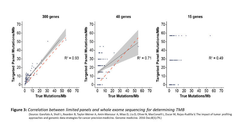 Do these panels correlate with mutation burden identified by WES? The evidence supports the use of such limited panel for TMB. The figure (Fig. 3) below shows the correlation between limited panel and WES. However, a panel size of .5MB is the minimal target size that is needed for such concordance and adequate sensitivity and specificity to achieve.