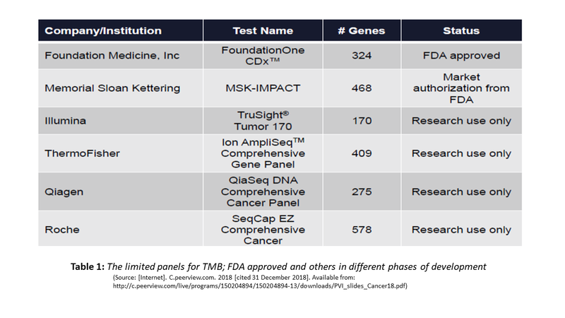 Originally, TMB was assayed using Whole Exome Sequencing (WES). Needless to say that such extended testing with long turnaround time and high cost cannot be an effective biomarker. Currently, shorter versions with a limited panel of genes have become the standard of testing TMB. Two TMB panels have received different levels of FDA approvals and several others are in different stages of validation. The table below exemplifies some of these: