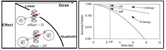 Figure-1: (a) Linear-quadratic Model; (b) Linear-quadratic cell survival curve, with α = 0.22 Gy-1 and α/β = 2.5 Gy (Log cell kill for α-type damage equals that for β-damage at a dose equal to α/β)