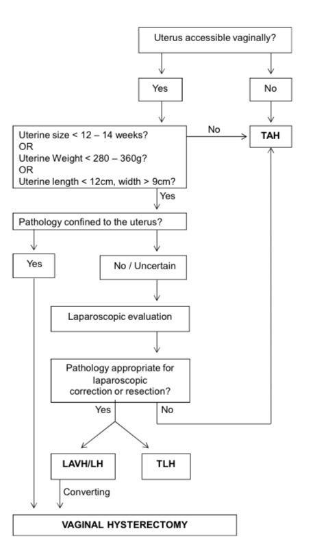 - Hysterectomy for benign indications should preferably be approached by either vaginal or laparoscopic routes.