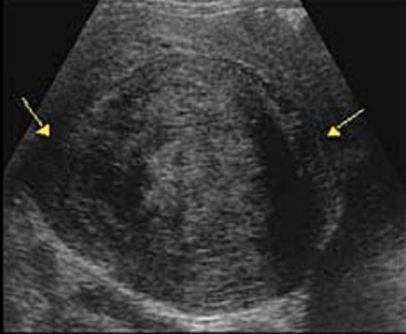 - Abdominal ultrasound showed a large subserosa fibroid on the dorsal aspect of the uterus.
