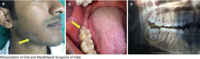 (a, b, c) Impacted right mandibular third molar with pericoronitis causing extraoral abscess (a) Extraoral abscess (Yellow arrow), (b) Impacted 48 with pericoronitis (yellow arrow), (c) OPG showing impacted 48 (Yellow circle)