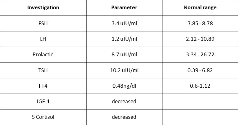 - MRI on 30/08/2018 suggested empty sella with extremely hypoplastic anterior lobe of pituitary.