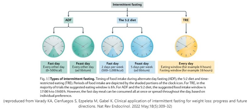 - Alternate Day Fasting (ADF): Alternate days of zero-calorie fasting and unrestricted eating. Modified ADF (MADF) consists of alternate days of 0 to 40% or 0-600 Cal intake and unrestricted eating.