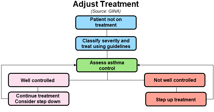 Adjustment of therapy is a continuous process and involves gauging asthma control and appropriate step up or step down of therapy.