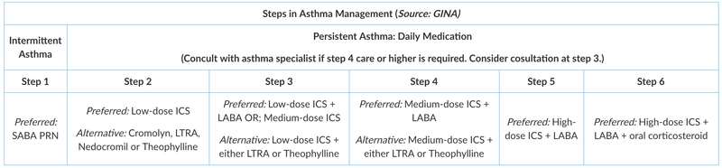 The overall strategy is to use a stepwise approach based on the level of severity. “Reliever” or “rescue” medications in the form of inhaled short-acting β2-agonist (SABA) are used on as needed basis is recommended for patients with very mild intermittent asthma who are asymptomatic between episodes.