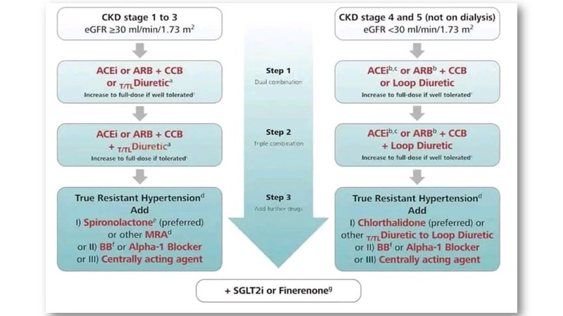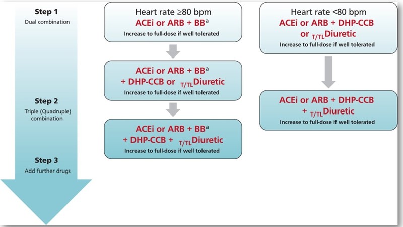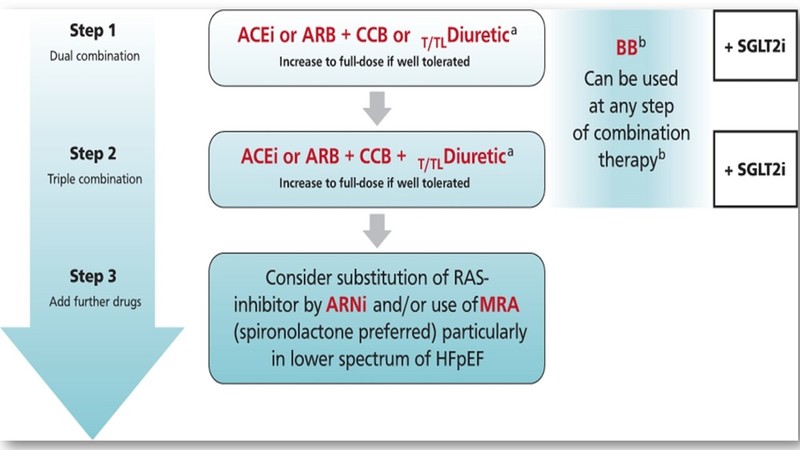- If patients remain with uncontrolled hypertension despite up-titration of drugs from the four major drug classes (RAS-inhibitors, BBs, MRAs, and SGLT2is) and use of additional treatment with a diuretic to manage fluid balance, a DHP-CCB can be added for BP control.