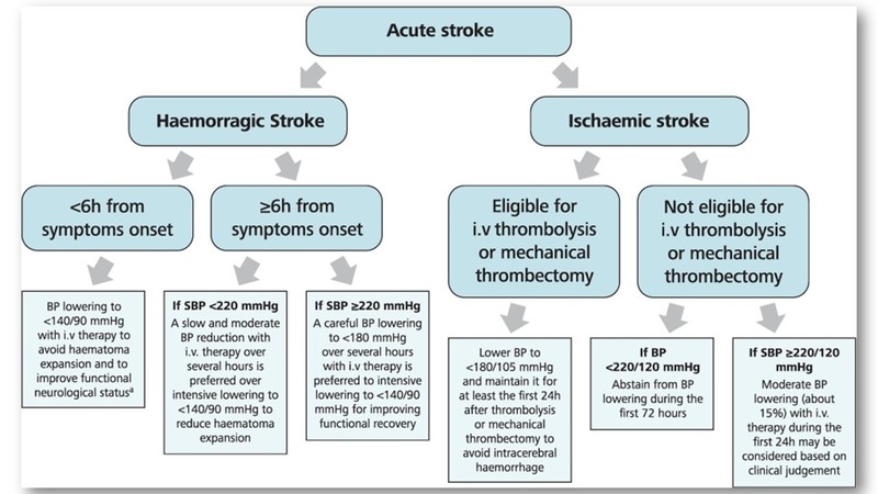 - In patients with acute ischemic stroke eligible for i.v. thrombolysis (IVT) or mechanical thrombectomy (MT), BP should be carefully lowered and maintained at <180/105 mmHg for at least the first 24 after intervention.