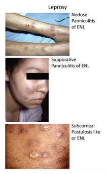 In the skin, M.leprae is found in keratinocytes, histiocytes and macrophages. Keratinocytes lead to the release of the antimicrobial peptide β-defensin in response to M.leprae antigens.