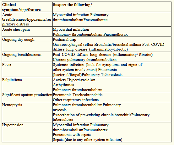 Differential diagnoses for typical cardiorespiratory system symptoms and indicators in the Post-acute COVID phase.