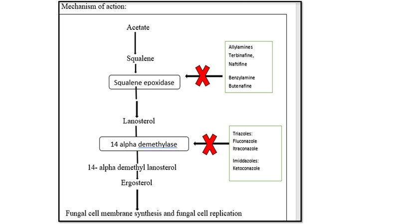 It inhibits squalene epoxidase leading to accumulation of intracellular squalene and deficient ergosterol, resulting in fungal cell death. The drug is well absorbed orally and reaches skin through two paths: diffusion from the vessels through the dermis or epidermis and via sebum in the hair follicle and skin.