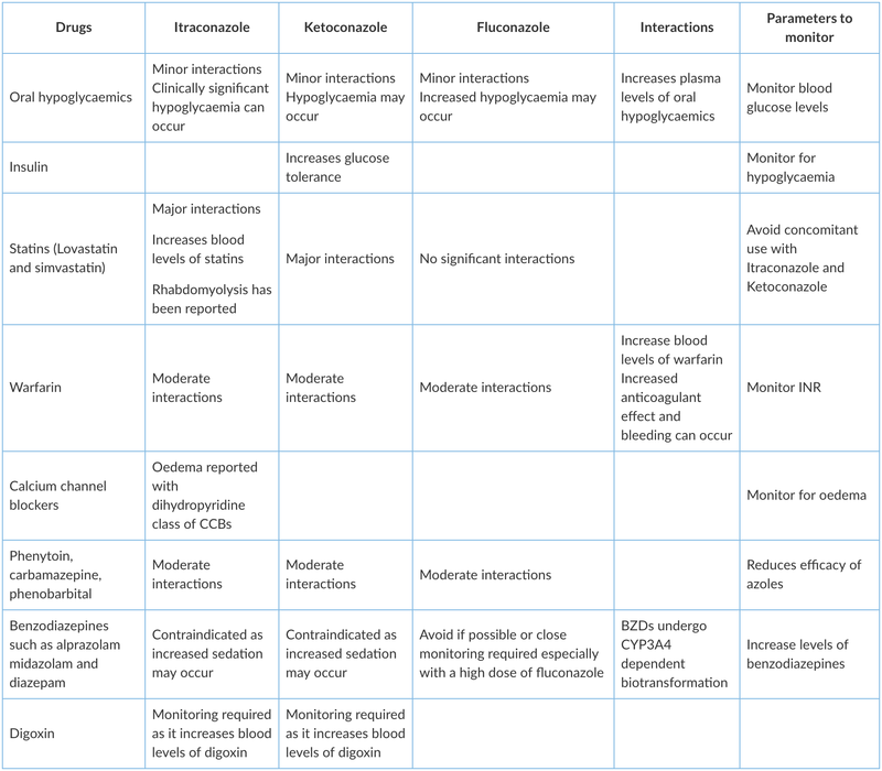 Diabetes mellitus is a state of suppressed immunity predisposing to increased risk of fungal infections particularly tinea pedis, onychomycosis and candidiasis as mentioned earlier. The patients also suffer from a host of other comorbidities like hypertension, dyslipidemia and coronary heart diseases. Comorbidities essentially lead to polypharmacy and many of these drugs have significant clinical drug interactions with antifungal agents. Hence, when treating fungal infections in diabetics, these drug interactions need to be taken into consideration.