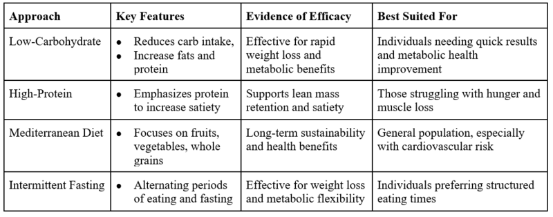 - Clinicians should consider the quality of the diet, macronutrient composition, and the patient’s unique circumstances when recommending weight loss approaches.
