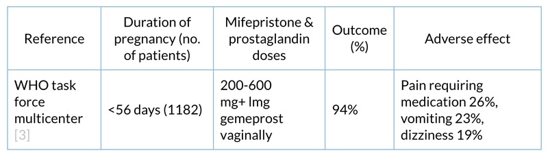 Numerous studies have the efficacy of various regimes of mifepristone and misoprostol or intravaginal gemeprost in the termination of early pregnancy up to 49 days duration: