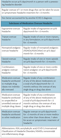 - Regular overuse for >3 months of one or more drugs that can be taken for acute and/or symptomatic treatment of headache.
