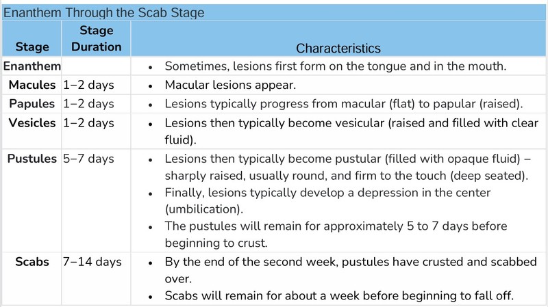 Rash: There have been instances of Mpox recently where patients have developed a rash without a known prodrome. Lesions in people infected with Mpox usually develop as papules, macules, vesicles, pustules, and finally scabs. A person is contagious until after all the scabs on the skin have fallen off and a fresh layer of intact skin has formed underneath.