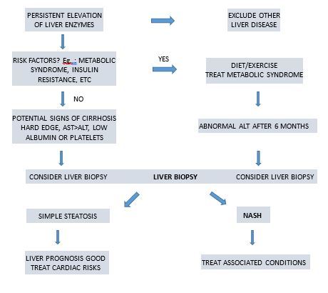 Higher levels of AST and ALT as well as AST/ALT ratio are significantly associated with NASH. Laboratory signs of advanced liver disease, such as hyperbilirubinemia, hypoalbuminemia, and abnormal prothrombin time are seen only in cases associated with cirrhosis. Other biological abnormalities, such as hyperglycaemia and hypertriglyceridemia are related to coexistent metabolic conditions. [19] Laboratory investigations for dyslipidaemia and insulin resistance should also be performed.