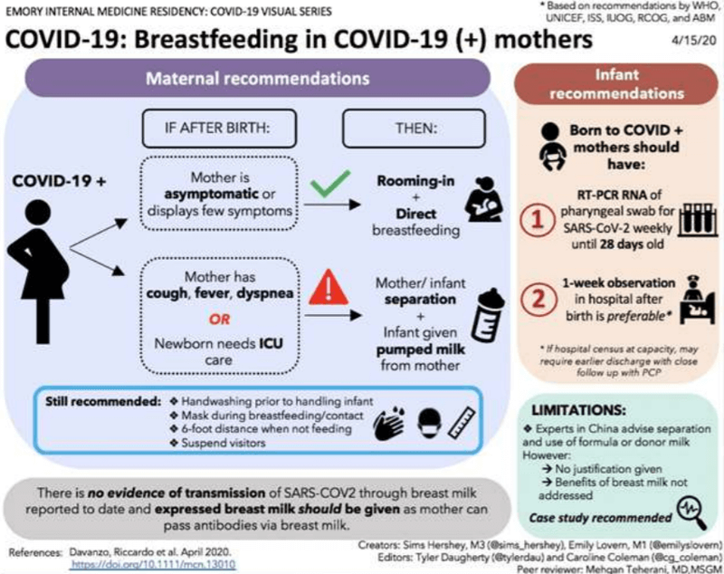 Breastfeeding: Mothers who wish to breastfeed should be allowed to express their breast milk through temporary separation to build and sustain milk supply. A designated breast pump should be given if necessary. Mothers should observe proper hand hygiene prior to expressing breast milk. Following each pumping session, thoroughly clean any pieces that come into contact with breast milk and disinfect the whole pump according to the manufacturer's instructions. A good caregiver should feed the newborn this expressed breast milk. If a mother and newborn stay in the same room and the mother wants to breastfeed, she should wear a facemask and exercise good hand hygiene before each feeding.