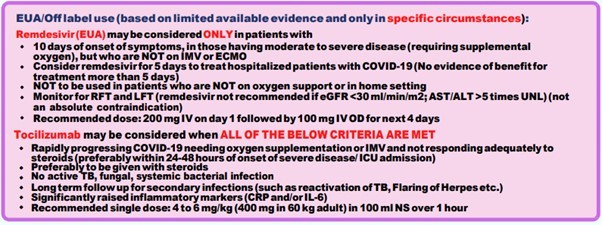 - If you're treating a hospitalised patient with COVID-19, consider using remdesivir for five days (No evidence of benefit for treatment more than five days).