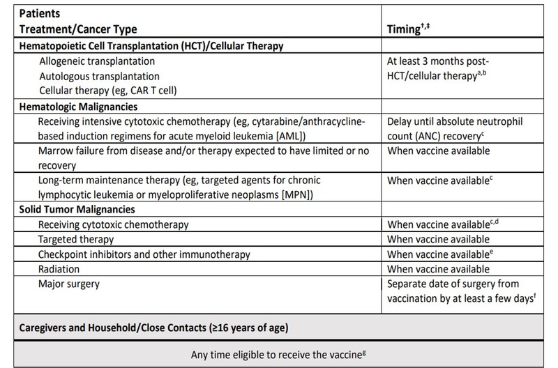 1. Cancer patients should be vaccinated for immunity as soon as vaccines are available for them. This includes patients receiving active therapy.