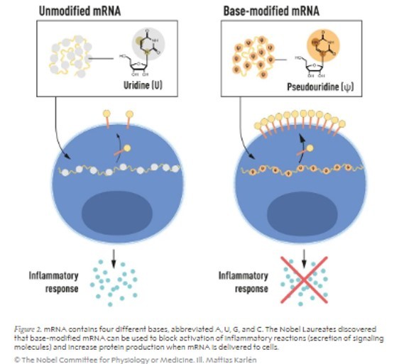 RNA, like DNA, comprises four bases: A, U, G, and C. Karikó and Weissman recognised that RNA from mammalian cells often undergoes chemical modifications, whereas in vitro transcribed mRNA lacks these modifications.