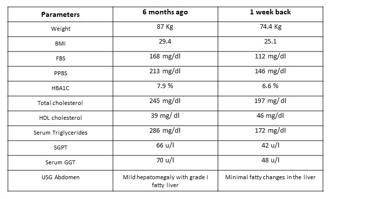 I am glad to share the reports of a 44-year-old male patient I saw 6 months back, and again a week back. He was taking two oral hypoglycemic agents and a statin when I first saw him 6 months back. He led a very busy and stressful work routine and had put on 10 Kg weight over the previous year. He was most willing to change his job and make positive lifestyle changes, which he subsequently did.