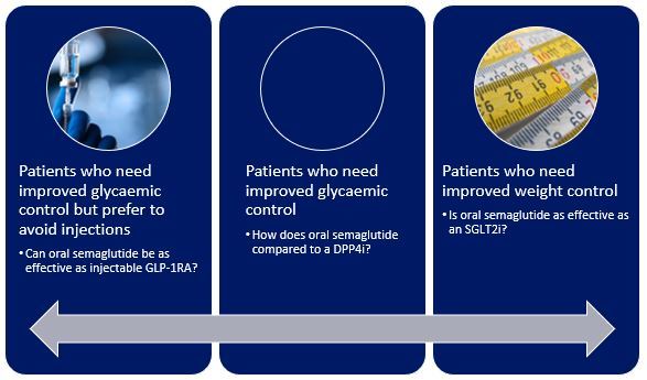 Efficacy and safety of oral semaglutide was tested in the comprehensive phase-3 Pioneer clinical trial programme that was designed with international recommendations and guidelines, as well as considering the clinical practice, in mind. It was tested in series of eight global and two Japanese phase-3 studies encompassing the continuum of treatment in type 2 diabetes mellitus, ranging from patients managed with diet and exercise only (drug-naïve), through to people already taking one or more, other anti-diabetic medications, those who require insulin, and in patients where cardiovascular and renal safety are concerns (Avgerinos et al., 2020; Meier et al., 2021).