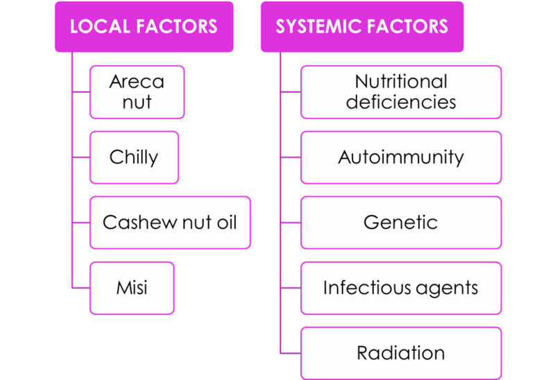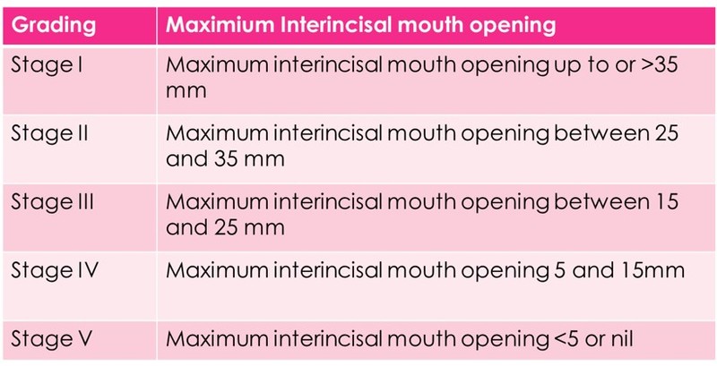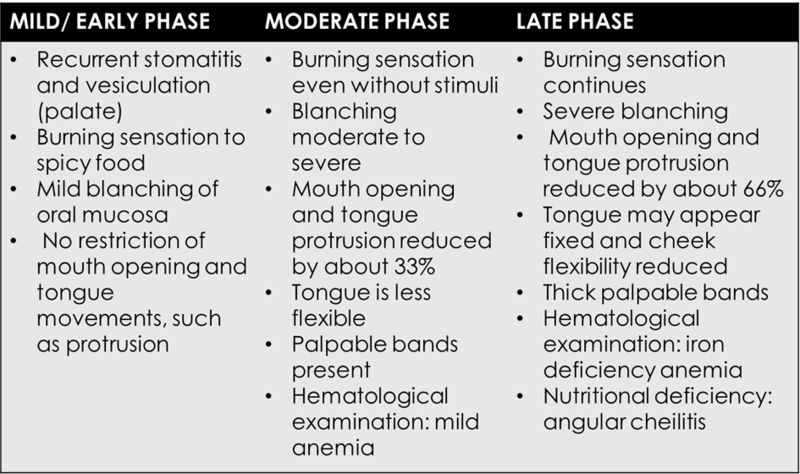 The oral mucosa undergoes various changes like inflammation, ulcerations, pigmentation, loss of resilience and flexibility, to a significant blanched and fibrosed appearance leading to rigidity and progressive inability to open the mouth.