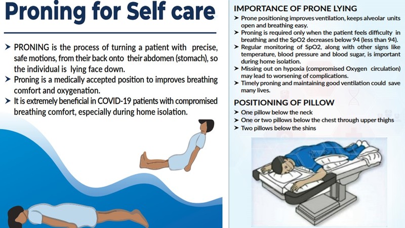 Proning should be attempted every 4 hours, and the patient should remain prone for as long as possible. The patient's anxiety frequently prevents them from proning, but they should be allowed to set realistic deadlines, such as 1 to 2 hours (or more if possible). The optimal time frame is 16 hours every 24 hours (e.g. 4 times for 4 hours each session).