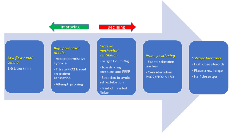 Step 2- Using clinical and blood gas criteria, identify patients that need ventilatory assistance; dyspnoea, tachypnoea, and imminent respiratory muscle weakness range from mild to extreme